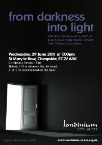 Londinium gave the first, sell-out performances of Perpetual Light: Requiem for an Unscorched Earth, an emotionally charged new work by the composer Jessica Curry, which fuses live choir, film and installation to create a profoundly moving experience remembering those who lost their lives in the nuclear attacks on Hiroshima and Nagasaki. The score, for unaccompanied chamber choir, combines the age-old Requiem text with powerful extracts from the writings of Robert Oppenheimer, father of the atomic bomb. Film and installation by artist Jo Fairfax completed the experience. Review: 'a dark, tormented piece, punctuated by moments of brightness...that radiated hope, the emotional thread that tied the whole piece together. From start to finish, Londinium perfectly captured this delicate emotion...' (Kay Kempin, Bachtrack).