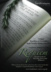 To mark Remembrance Day, Londinium performed a moving programme of unaccompanied choral responses to death and mourning, from Hubert Parry's powerfully lyrical Songs of Farewell to the quieter anguish of Herbert Howells' Requiem. Three haunting part-songs by contemporary American composer Eric Whitacre (including the chilling lament When David Heard, A Boy and a Girl and Sleep) and Howells' Take Him, Earth, for Cherishing (dedicated to the memory of John F Kennedy) completed a modern-day Requiem. The Cambridge performance was attended by Eric Whitacre, who commended Londinium for giving ‘One of the most beautiful performances of 'Sleep' I have ever heard’.